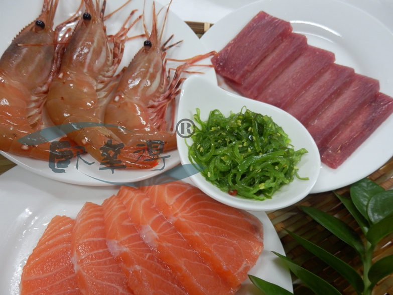 蓝鳍金枪鱼赤身180G/盒/1盒,冰鲜三文鱼200G/盒/1盒,牡丹虾3只/盒/1盒,赠海草250G。